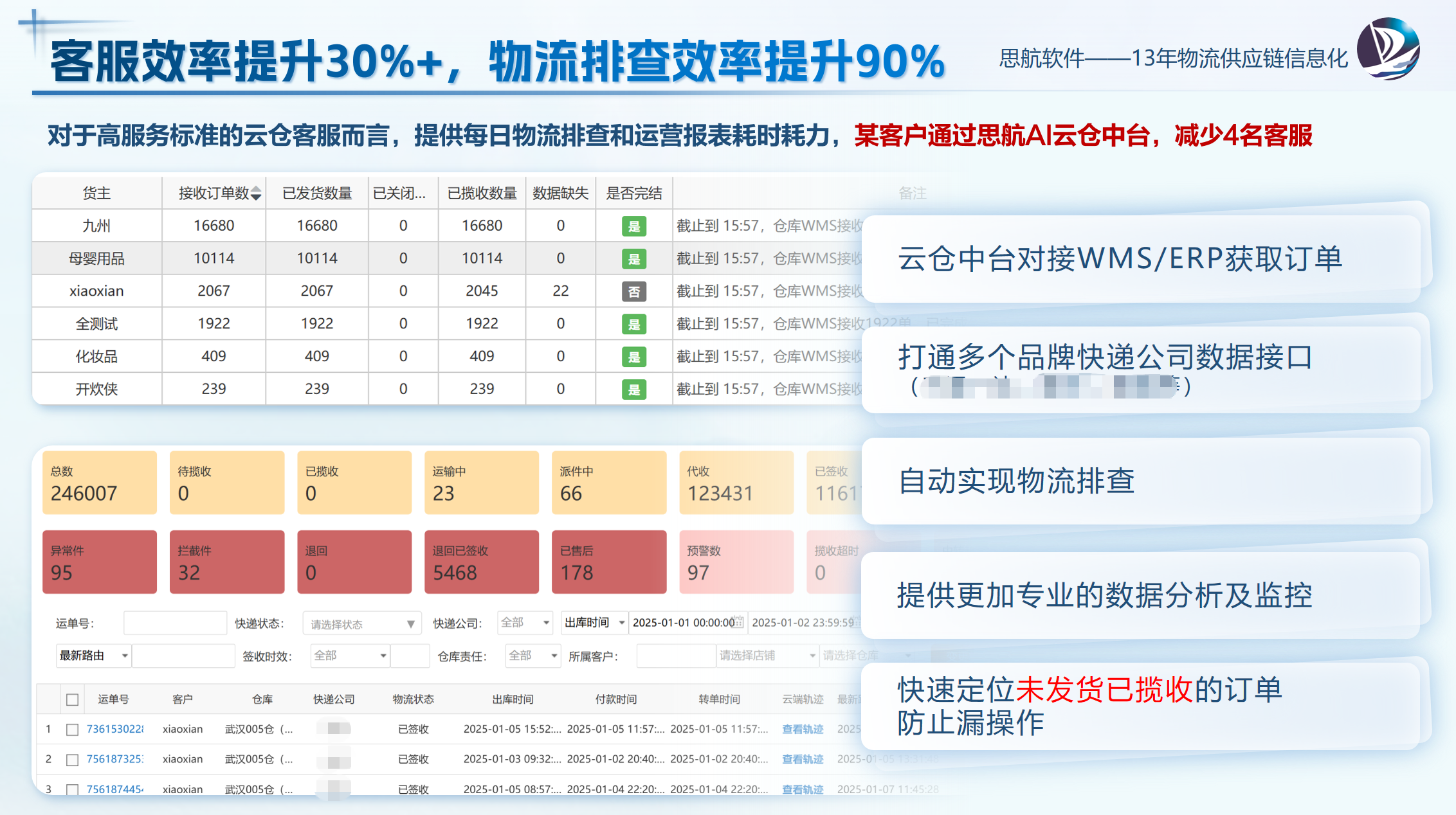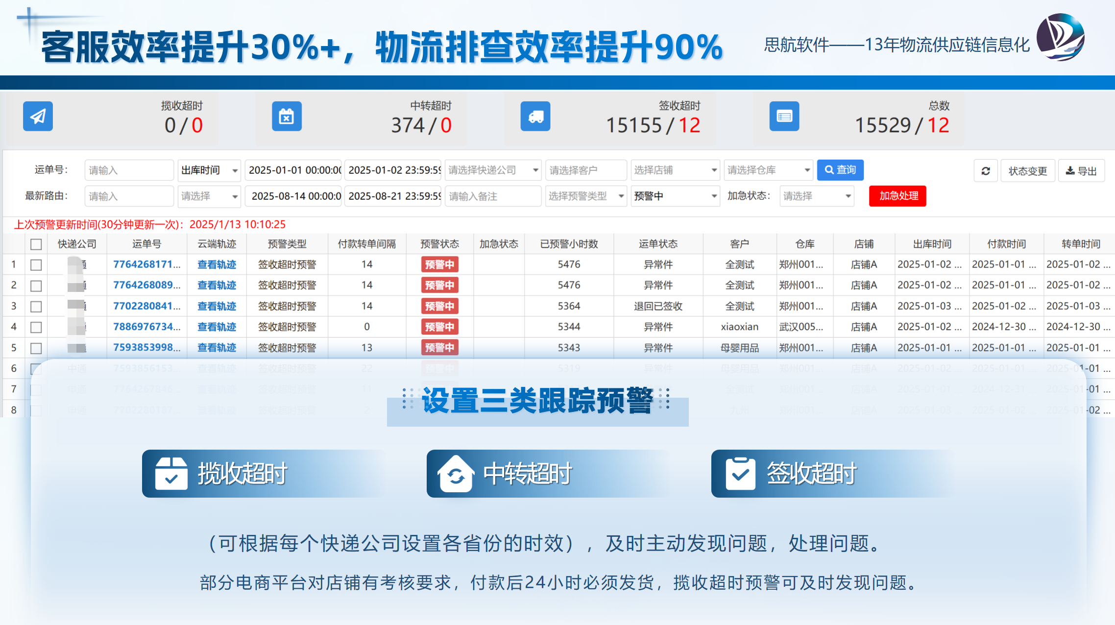 通过导入快递单号,批量查询物流轨迹信息,监控在途情况。可设置预警条件(超时签收、物流超时未更新),自动预警。